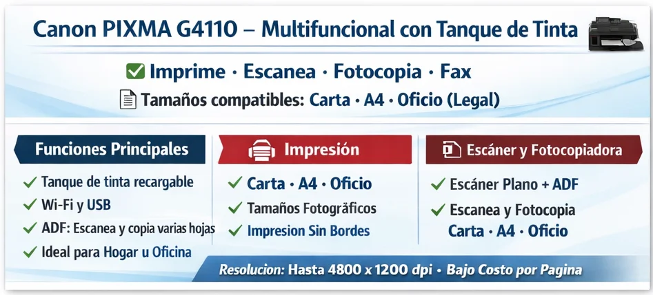 La Canon PIXMA G4110 es una multifuncional 4 en 1 (imprime, copia, escanea y fax) diseñada para quienes buscan ahorro y productividad. Su sistema MegaTank híbrido rinde hasta 6,000 páginas en negro y 7,000 a color, con tanques recargables frontales fáciles de usar.