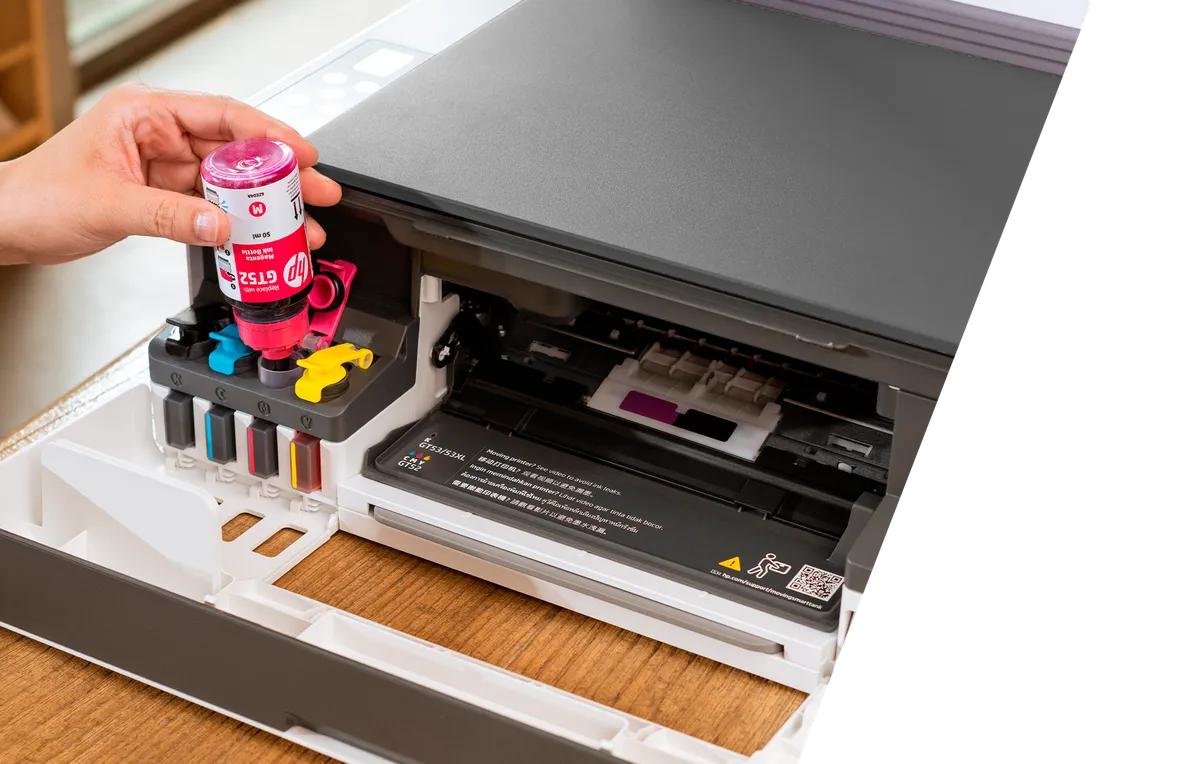 Botellas antiderrames codificadas por color para una fácil recarga. Controla y mantén fácilmente tus niveles de tinta con los sensores integrados.